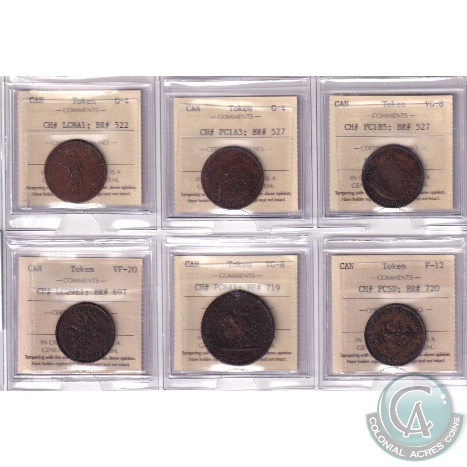 Canada ICCS Certified Token Collection. You will receive the following, CH#LC8A1; BR#522 G-4, CH#PC1A3; BR #527 G-4, CH#PC1B5; BR#527 VG-8, CH#LC29E1; BR#697 VF-20, CH#PC6A1; BR#719 VG-8, and CH#PC5D; BR# 720 F-12. 6pcs.