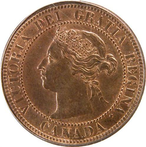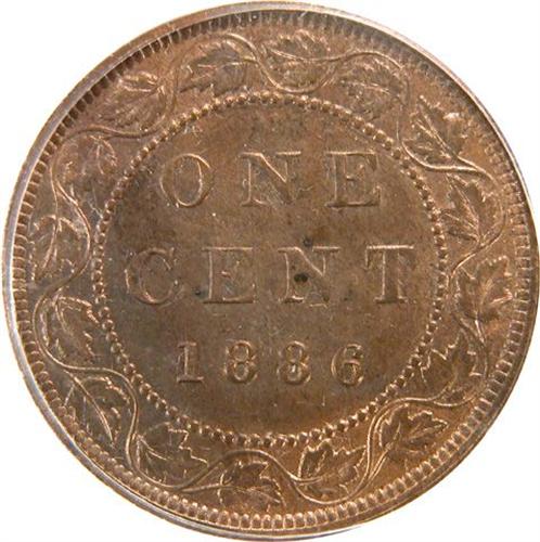 Canada Large Cent 1886 Obverse 2 ICCS and PCGS MS-64 Red and Brown. This is a fully struck piece with great lustre and rather flawless surfaces that are about 75% red. It is tied as the highest of the date by ICCS