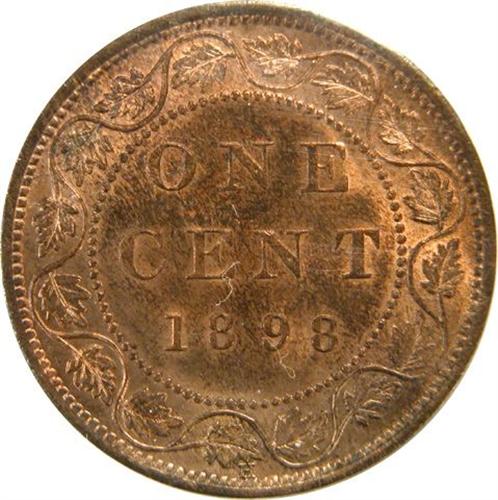 Canada Large Cent 1898H ICCS MS-64 Red and Brown. This is a fully struck and strongly lustrous piece with near flawless 65% red surfaces. It is tied fourth highest by ICCS