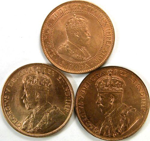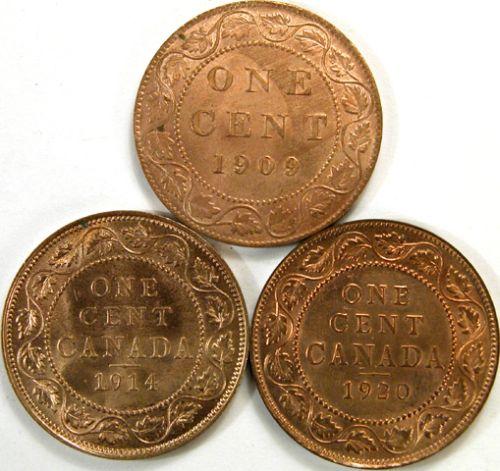 Canada Large Cent 1909, 1914 and 1920. Three pieces, Red Uncirculated to Choice Red Uncirculated, over 90% red