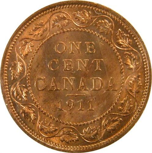 Canada Large Cent 1911 ICCS MS-65 Red. This is a fully struck piece with great lustre and near flawless surfaces that are over 90% red. It is tied at the third highest by ICCS