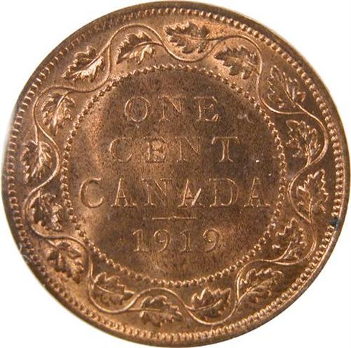 Canada Large Cent 1919 ICCS MS-65 Red. This is a fully struck piece with great lustre on near flawless surfaces that are about 90% red. Tied third highest by ICCS
