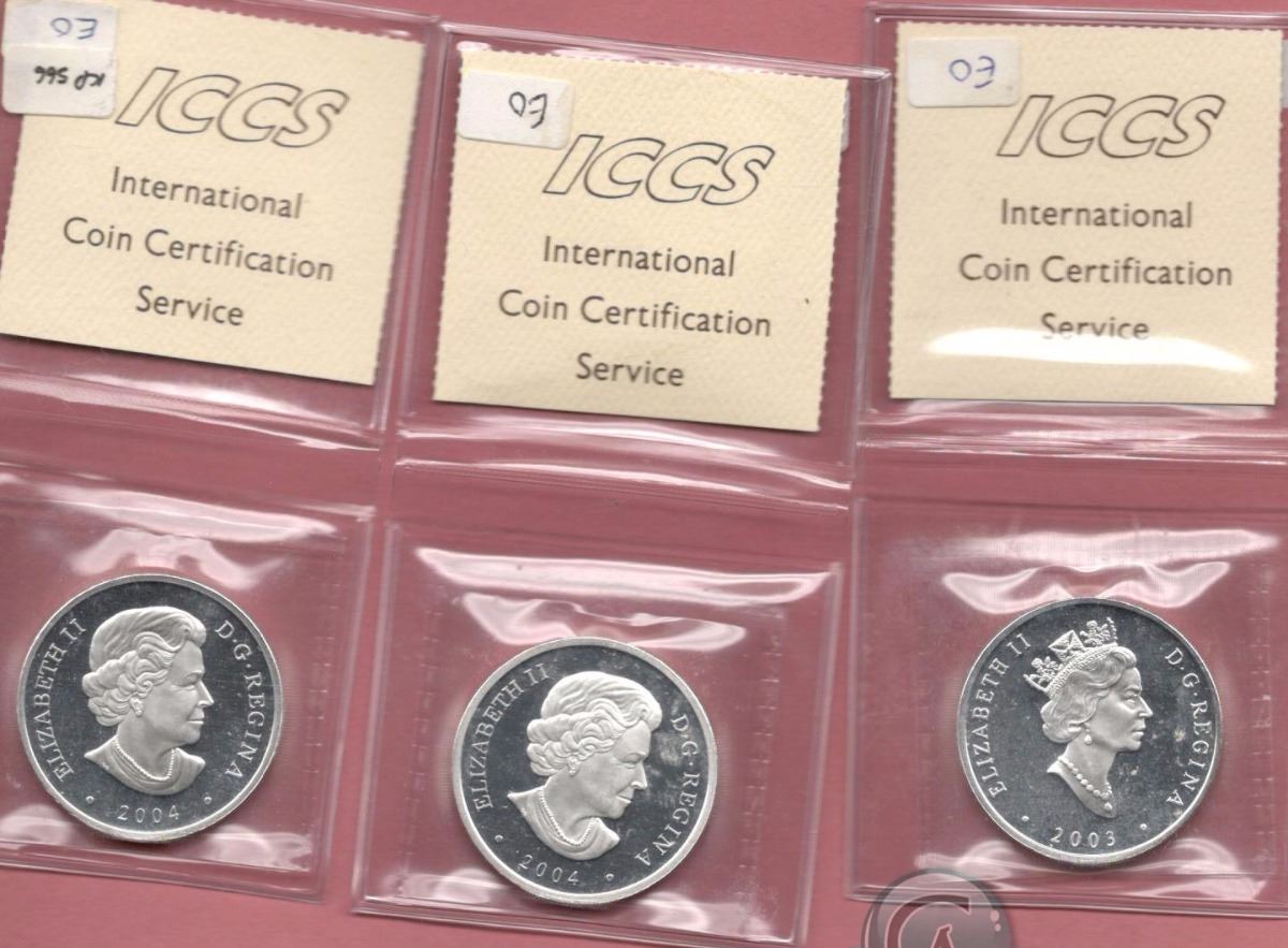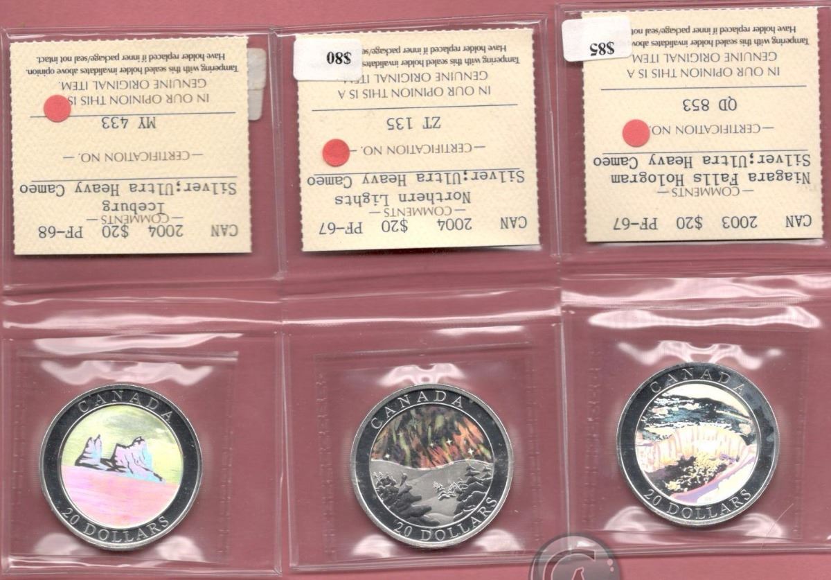 Canada Lot of 3 RCM —2004 Silver $20 Iceberg, Ultra Heavy Cameo, ICCS PF-68; 2004 Silver $20 Northern Lights, Ultra Heavy Cameo, ICCS PF-67; and 2003 Silver $20 Niagara Falls Hologram, Ultra Heavy Cameo, ICCS PF-67.