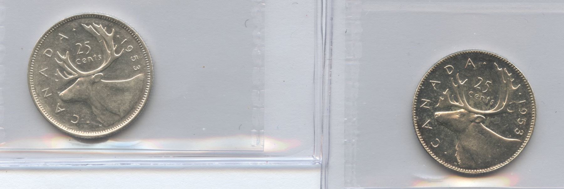 Includes: 1943 Ten Cents MS63. 1947 Twenty-Five Cents EF40, Maple Leaf. 1950 Ten Cents MS64. 1953 Ten Cents MS64, NSF. 1952 Ten Cents MS64. 1953 Twenty-Five Cents MS60, Small Date. 1953 Twenty-Five Cents MS64, Large Date. 7 pcs.