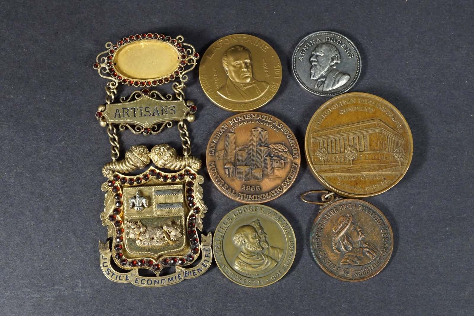 1)Bronze Obverse: LAFONTAINE... 1807-1864, Lafontaine head, Reverse:ASSOCIATION ST-JEAN BAPTISTE DE MONTRÉAL...75e ANNIV...,1909, society arms, signed A.BARGAS, unmarked plain edge XF, 40mm, 32.9 gr
