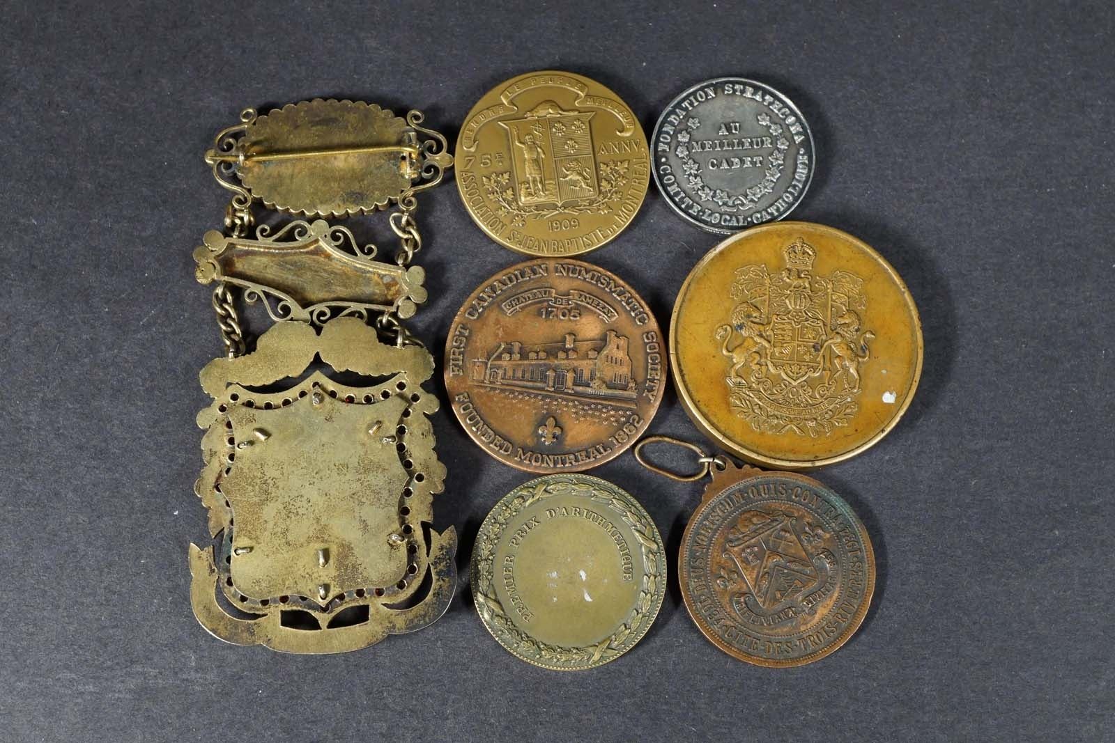 4) Bronze Obverse: MEDAILLE LUDGER GRAVEL... 2 heads at left marked Caron, Montréal, Reverse: PREMIER PRIX D'ARITHMÉTIQUE, foliage crown, unmarked plain edge VF 38mm, 24.9gr.