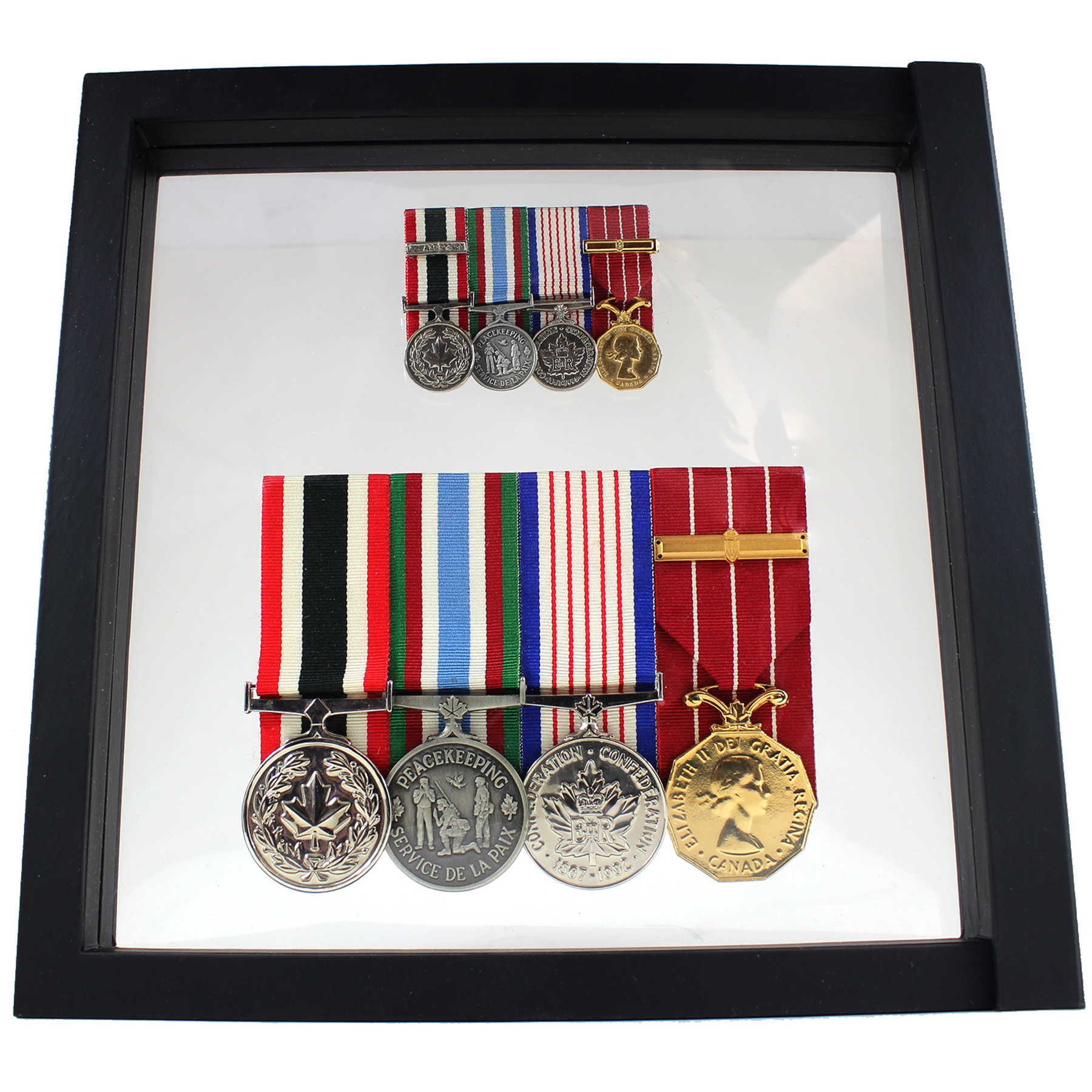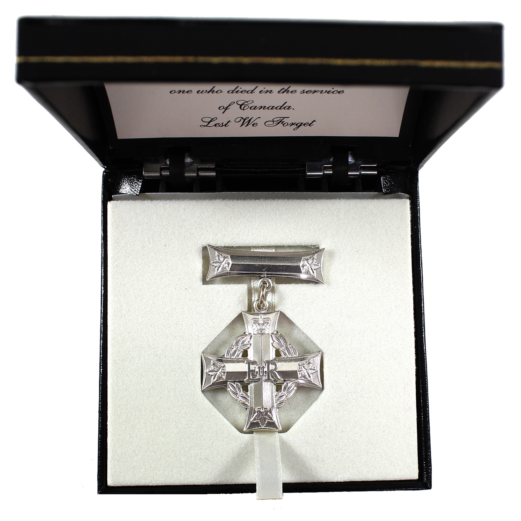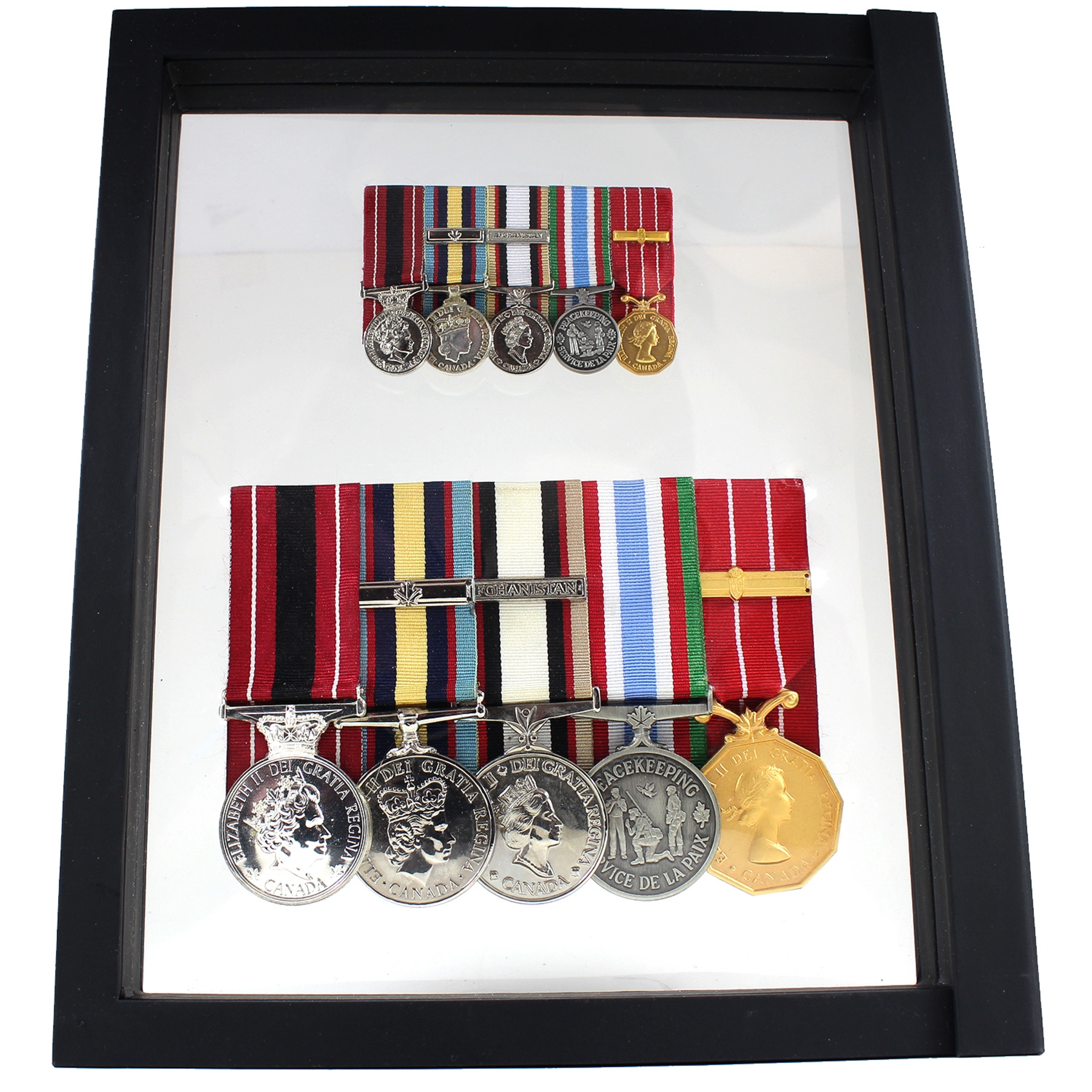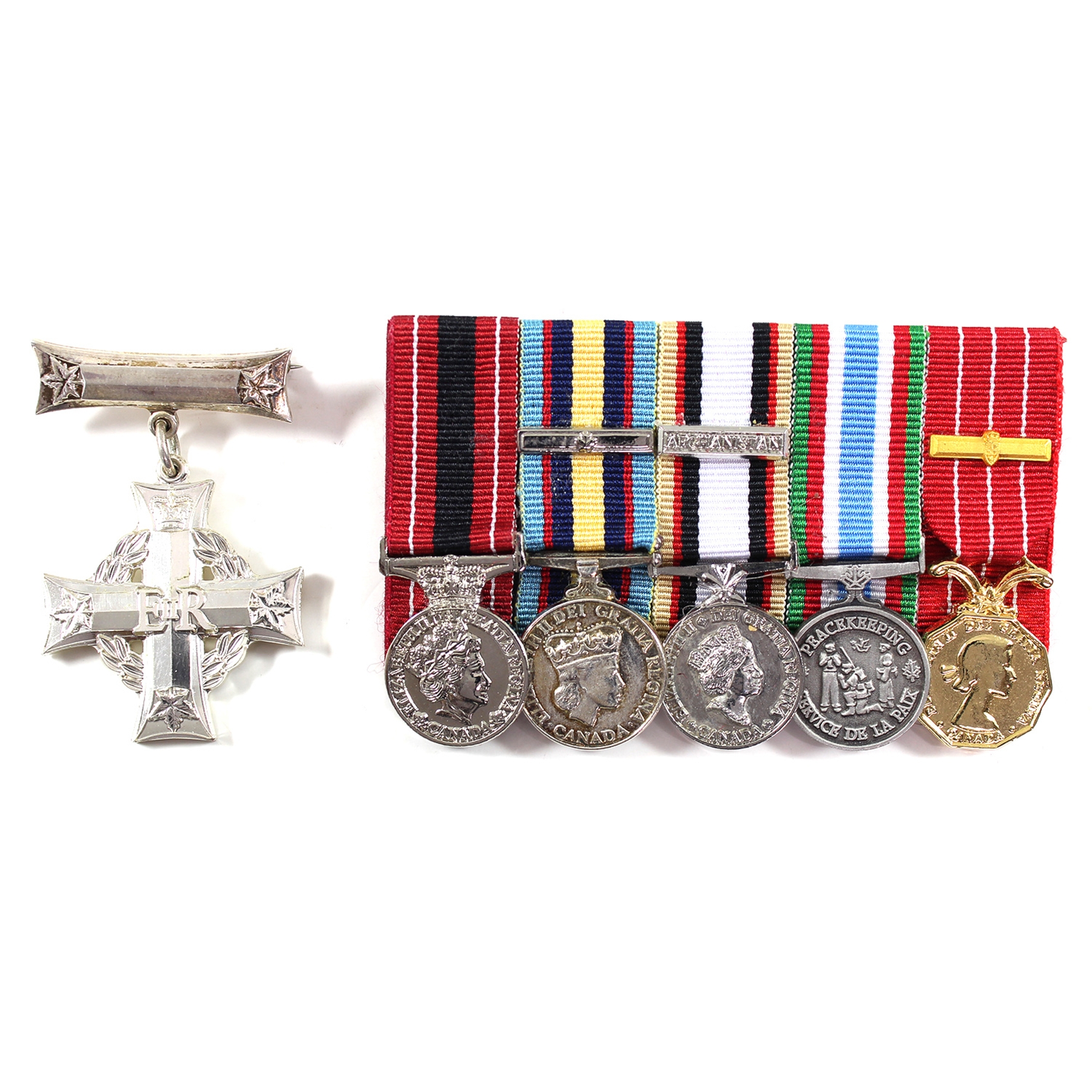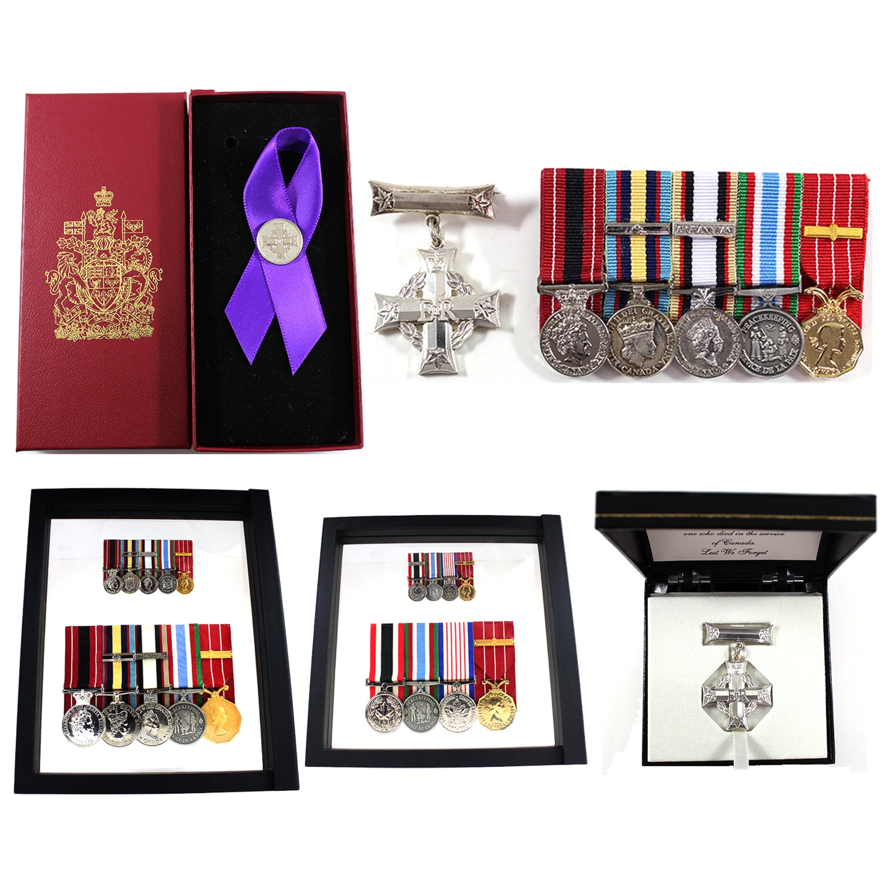 INCLUDES: 5-Piece Medal Grouping--Sacrifice Medal NAMED N23678646 MWO LMS Frederiksen, Gulf and Kuwait Medal w/ Bar, South-West Asia Service Medal w/ Afghanistan Bar, Canadian Peacekeeping Service Medal, & Canadian Forces' Decoration NAMED- CAPT MI Cole; 2x Miniature Versions of Aforementioned Grouping; Memorial Ribbon, 2x Memorial Cross NAMED-N23678646 MWO LMS Frederiksen (one in original box, the other potentially a requested duplicate); 4-Piece Medal Grouping--Special Service Medal, Canadian Peacekeeping Service Medal, 125 Anniversary of the Confederation of Canada Medal, & Canadian Forces' Decoration UNNAMED; & Miniature Version of Aforementioned Medal Grouping. A very unique and rare offering!
