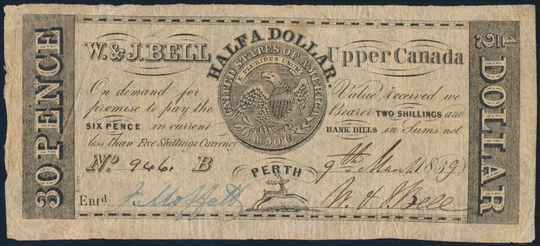 Canada Merchant Scrip W & J. BELL Perth, Upper Canada 30 Pence 1839