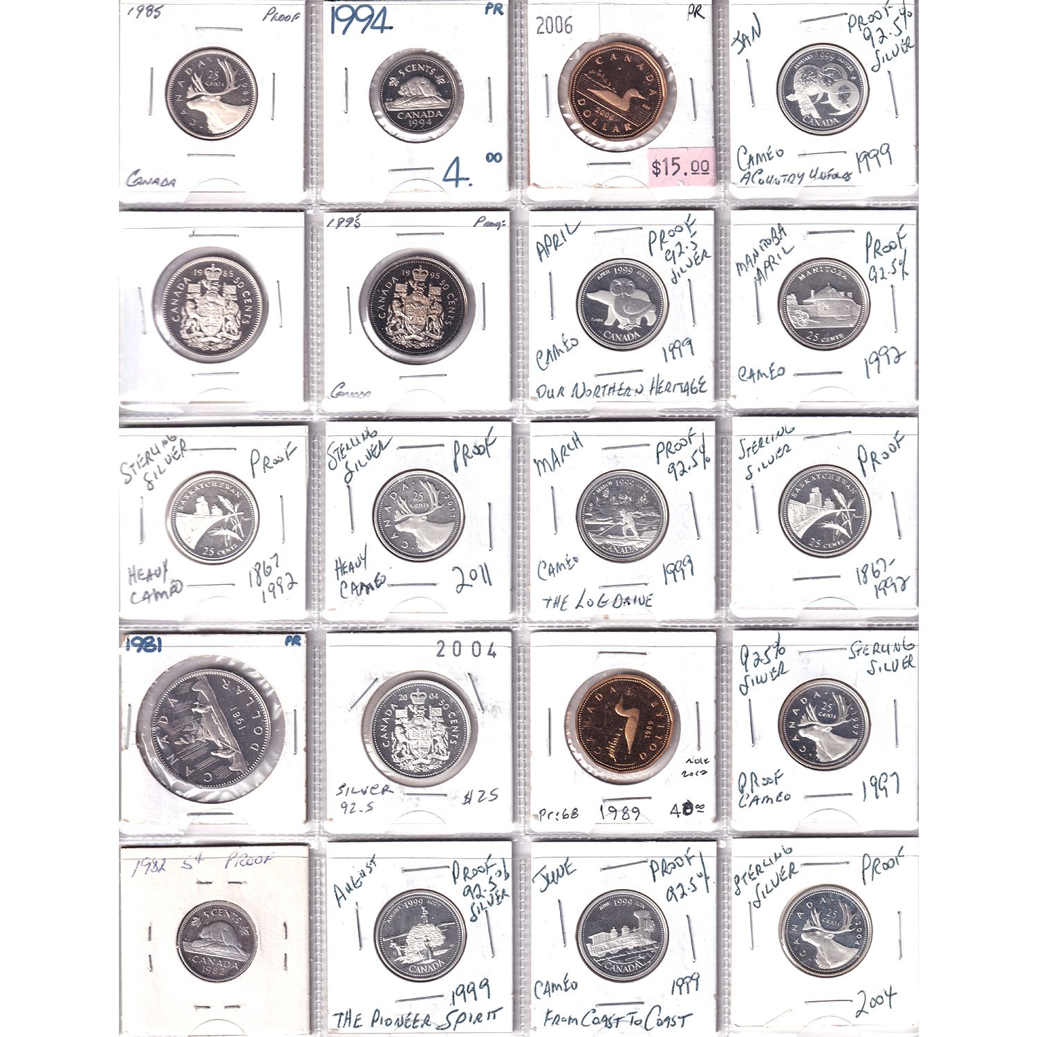INCLUDES: 1995 50-cent, 1999 25-cent The Log Drive, 2004 50-cent & Many More!! Coins may contain various imperfections; please see images for details. 20pcs.