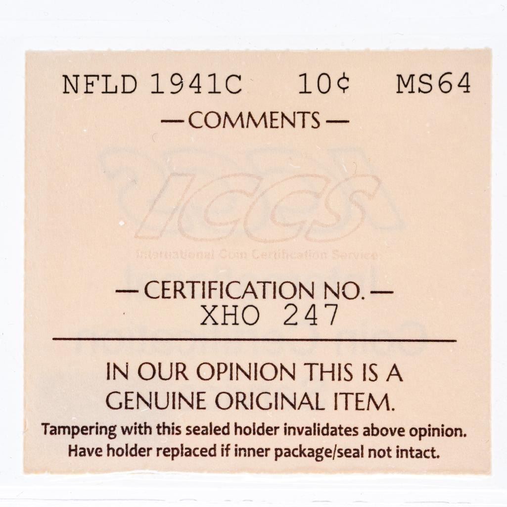 Canada, NFLD 1941C Silver 10 cents MS64 ICCS