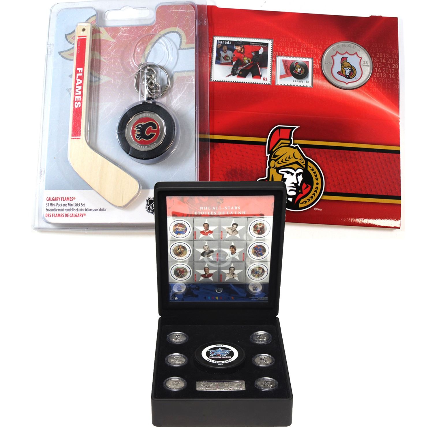 Canada NHL Coin Collection. You will receive the 2009 $1 Calgary Flames Mini-Puck & Mini-Stick Set, 2012 Ottawa Senators 25-cent Coin & Stamp Set, and 2001 NHL All-Stars Medallion and Stamp Set with Collector Puck Issued by Canada Post. 3pcs.