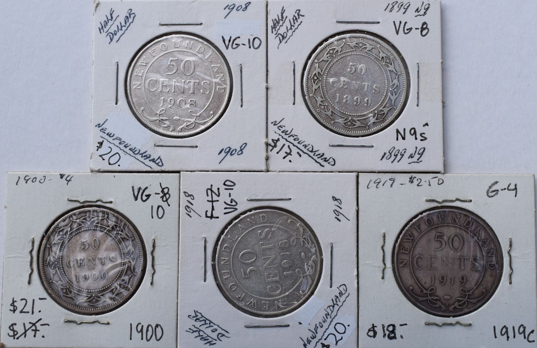 Canada, Newfoundland 0.50c Silver 1899 (Obv. 2 Narrow 9s), 1900 (Obv.2) 1908, 1918-C & 1919-C Grade G+ / VG+ or Better (5)