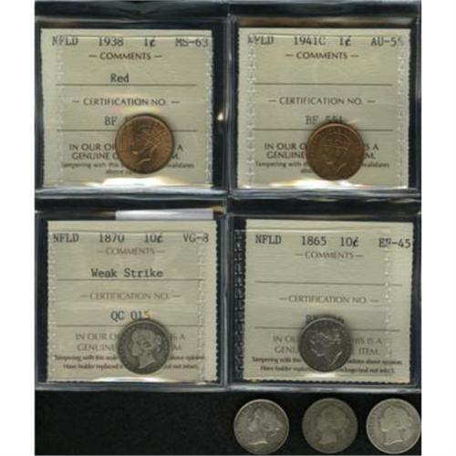 <B>Newfoundland Assorted Minors,</B></I> Cent 1938 MS63 Red ICCS and 1941C AU55 ICCS, abundant mint luster, and Victoria 10 Cents, five pieces: 1865 XF45 ICCS, 1870 VG-F, small surface marks, 1870 VG8 ICCS weak strike reverse, 1885 toned VG-F and 1888 VG/F. <B>Sold as is, no return lot.</B></I><BR><BR><b>Shipping:</b> Coins & Currency (<a target="_blank" href="http://www.heritageauctions.com/common/shipping.php">view shipping information</a>)