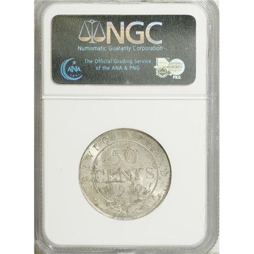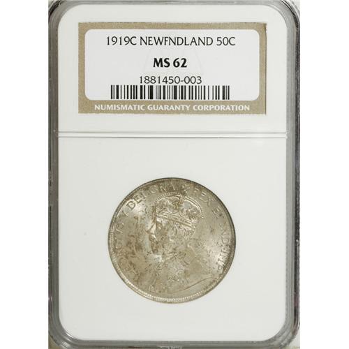 <B>Newfoundland. George V 50 Cents 1919C, </B></I>KM12, MS62 NGC, somewhat mottled toning over fully brilliant surfaces, very scarce grade.<BR><BR><b>Shipping:</b> Coins & Currency (<a target="_blank" href="http://www.heritageauctions.com/common/shipping.php">view shipping information</a>)