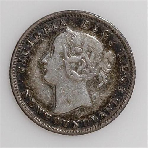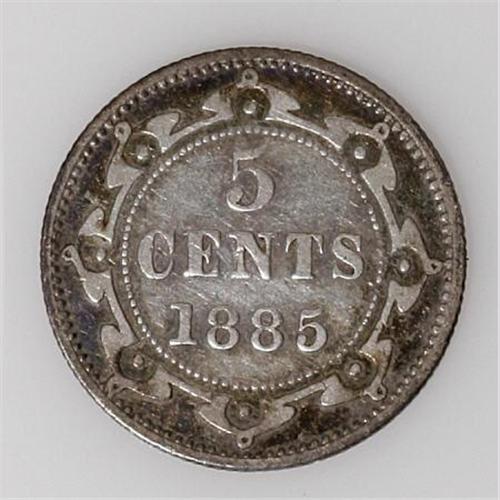 <B>Newfoundland Victoria 5 Cents 1885,</B></I> KM2, toned F-VF, few small surface marks, rare date.<BR><BR><b>Shipping:</b> Coins & Currency (<a target="_blank" href="http://www.heritageauctions.com/common/shipping.php">view shipping information</a>)