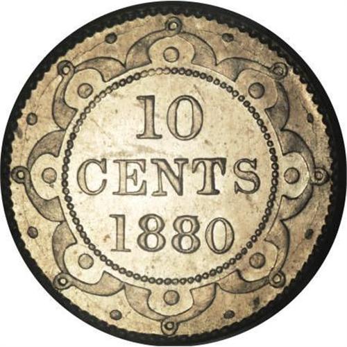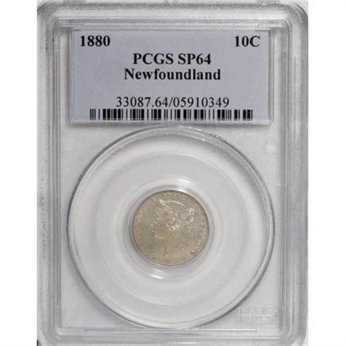 <B>Newfoundland Victoria Specimen 10 Cents 1880, </B></I> KM3, Specimen 64 PCGS, a gorgeous coin with meticulously sharp details, mirror surfaces and an extremely bold second 8/7 overdate. Very rare in this preparation.<BR><BR><b>Shipping:</b> Coins & Currency (<a target="_blank" href="http://www.heritageauctions.com/common/shipping.php">view shipping information</a>)