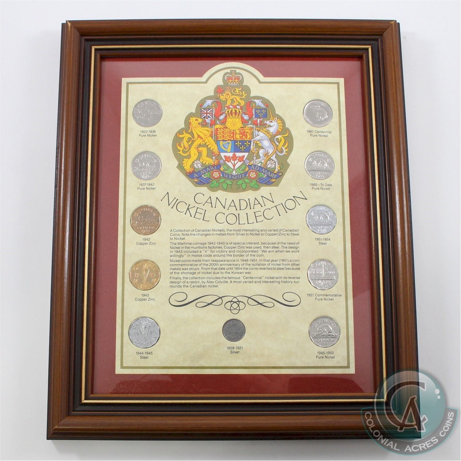 Canada Nickel Collection in Frame. You will receive 11 coins in this collection representing the different designs throughout Canada's history up to 1967, in a Custom Frame for display.