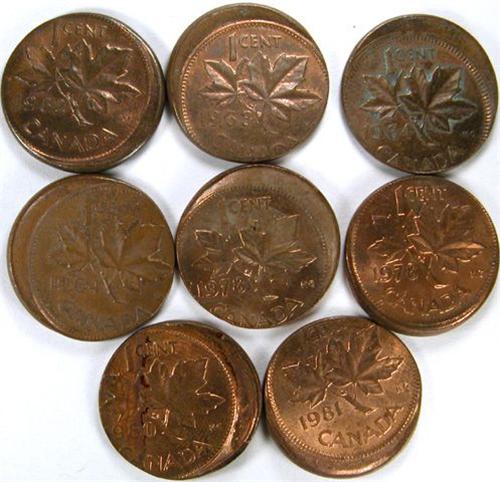 Canada One Cent 1962, 1963, 1964 two pieces, 1978 two pieces, 1980 and 1981. Total eight pieces, AU and Uncirculated, all Struck Off-Centre about 10%