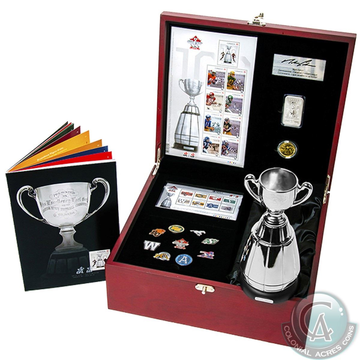 2012 Ultimate CFL Fan Set in Beautiful Wooden Display Case. This set features a miniature Grey Cup trophy, 1oz .9999 Fine Silver Bar, Grey Cup Loonie, 9x Commemorative Stamps and Pins for all teams, and informative history booklet. The teams celebrated in this set includes: BC Lions, Edmonton Eskimos, Calgary Stampede, Saskatchewan Roughriders, Winnipeg Blue Bombers, Hamilton Tiger Cats, Toronto Argonauts, and the Montreal Alouettes.