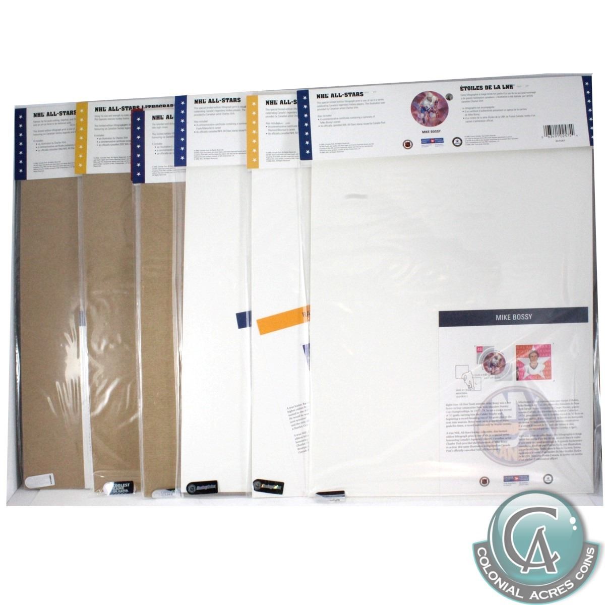 Canada Post Issue: Lot of 7x 2002 & 2003 Limited Edition NHL All Stars Lithographs. This lot includes 2002 Tim Horton, 2002 Phil Esposito, 2002 Howie Morenz, 2002 Red Kelly, 2003 Frank Maholvich, 2003 Raymond Bourque and the 2003 Mike Bossy Lithograph (7pcs)