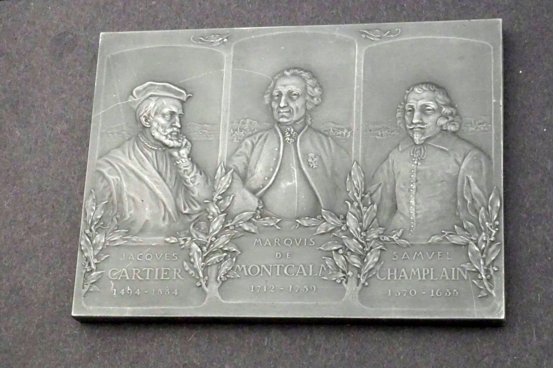Canada - Rectangular Medallic Probably Aluminum Plaque Featuring Cartier, Montcalm and Champlain.Made by DESCHIENS EDITOR, PARIS. Signed: EXBRAYAT, SCULPTR. 81 x 110 mm. 133.4 grams. Grey toned. Obverse: Half-length portraits of l. to r., Cartier, Montcalm & Champlain. Reverse: A French ship approaching land, two native men, one behind a tree, the other falling or running. Below to center, a beaver. A small certificate is included.