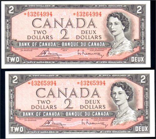 1954 Two Dollars Bouey-Rasminski, BC-38cA Serial Number *A/G3264994 and *A/G3265994, both of them Uncirculated