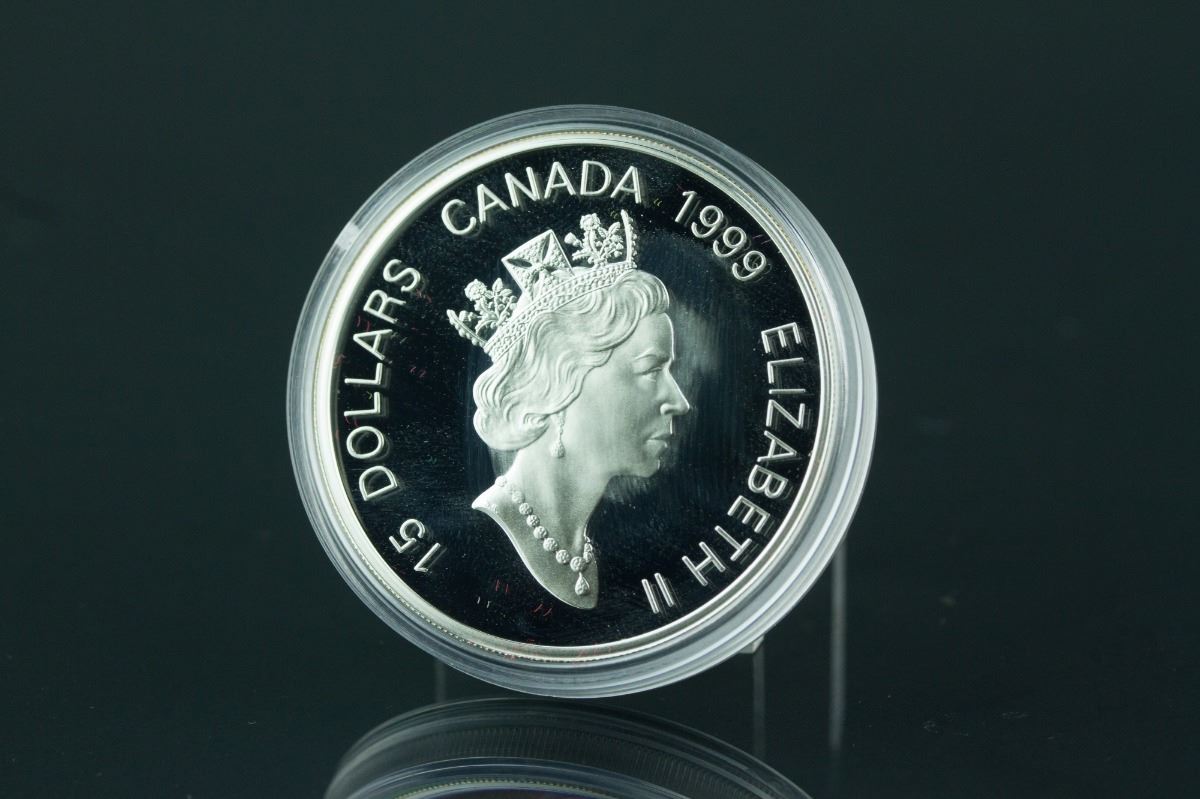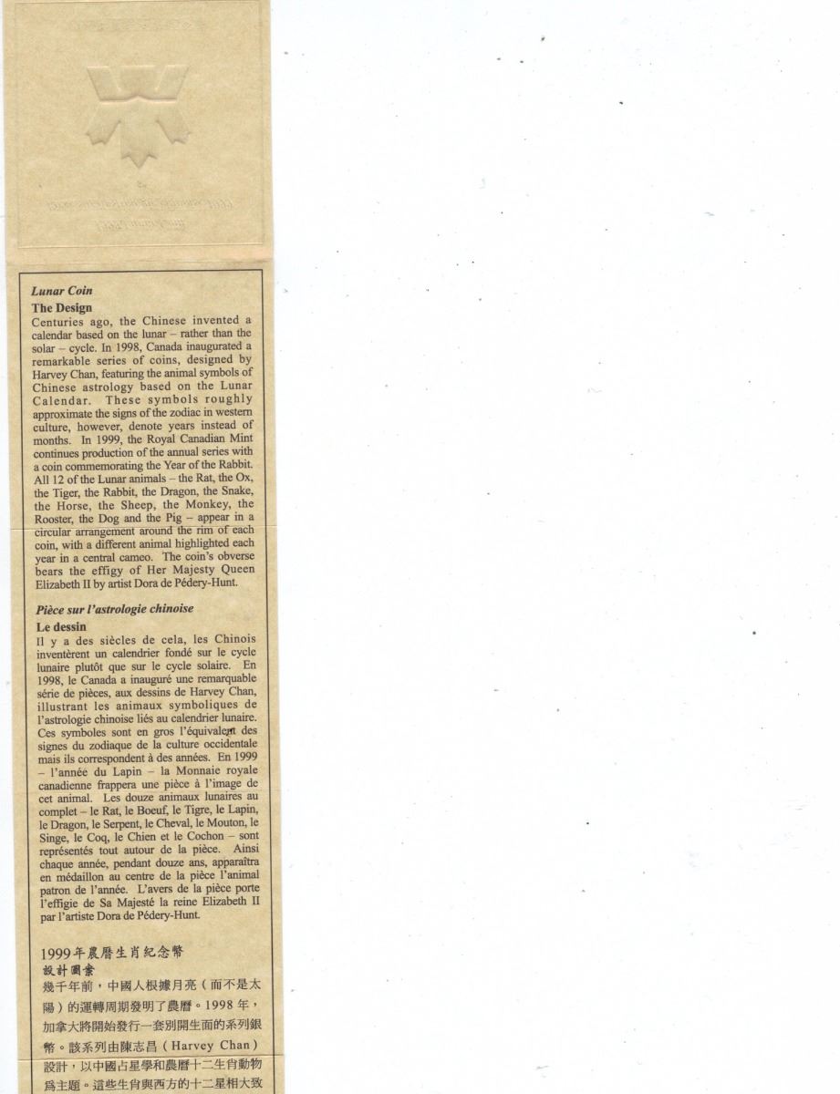 Sterling Silver Chinese lunar rabbit year 1999 coin with certificate; 15 Dollars Canada 1999 Elizabeth II on back and rabbit with twelve zodiac animals on front; 92.5% Silver and 7.5% Copper with gold plated center; H: 0.3 cm, D: 4.5 cm, 40 grams