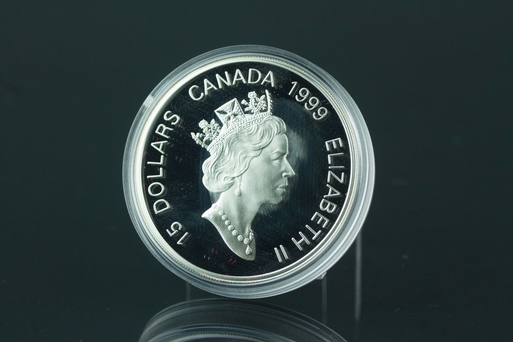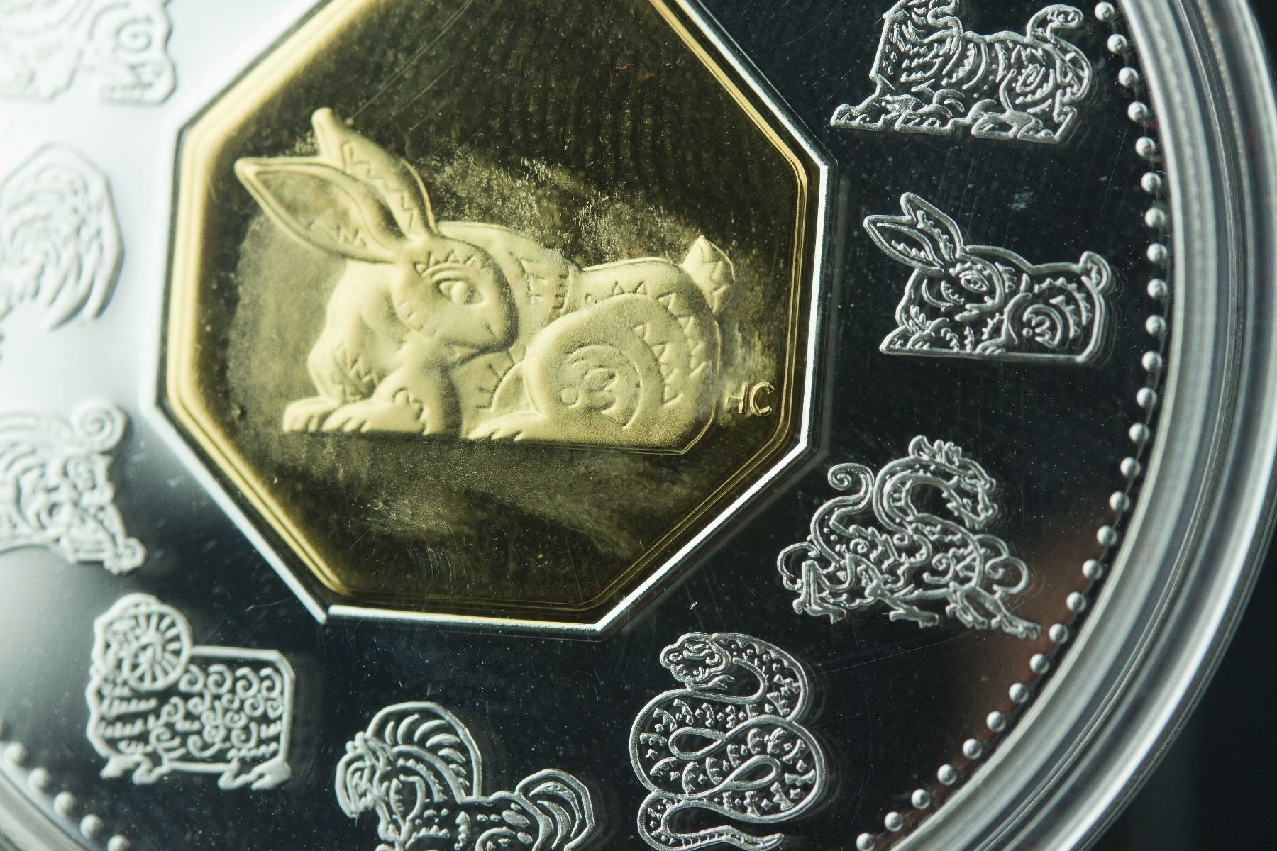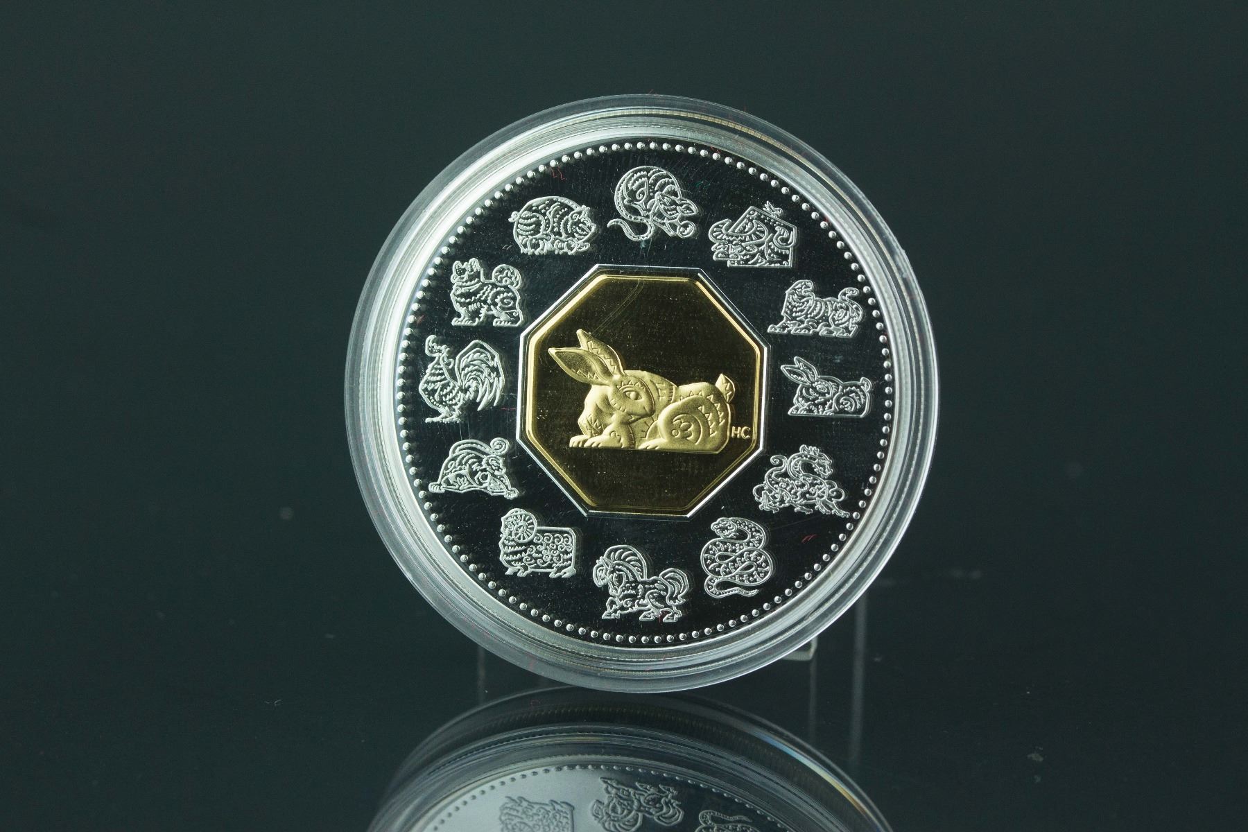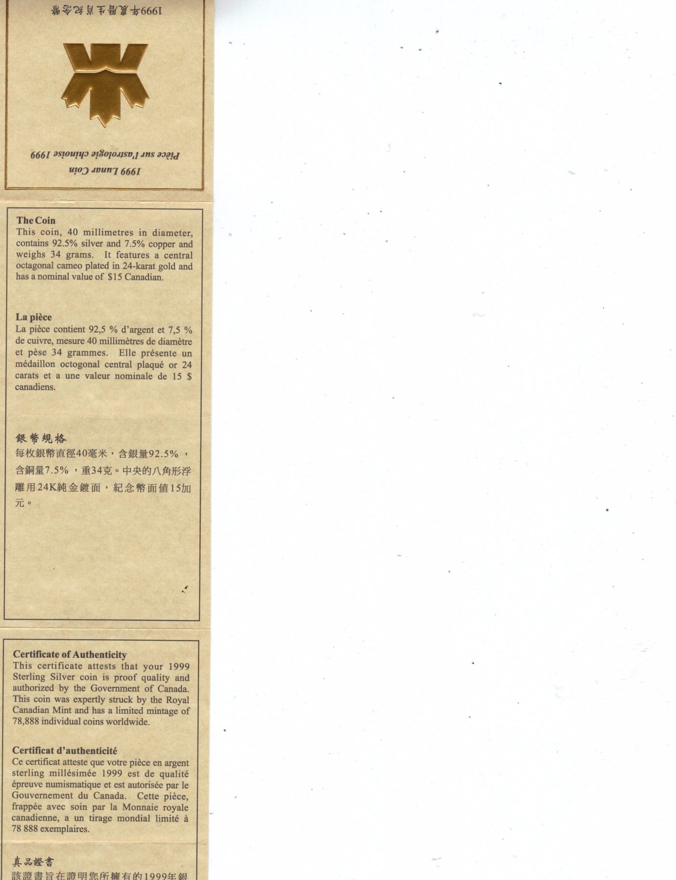 Sterling Silver Chinese lunar rabbit year 1999 coin with certificate; 15 Dollars Canada 1999 Elizabeth II on back and rabbit with twelve zodiac animals on front; 92.5% Silver and 7.5% Copper with gold plated center; H: 0.3 cm, D: 4.5 cm, 40 grams