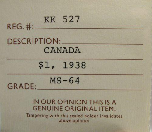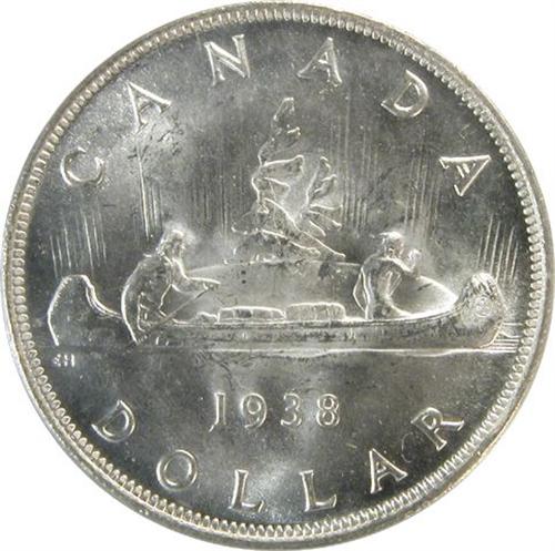 Canada Silver Dollar 1938 Very Choice Uncirculated. This is a fully struck piece with great lustre and near flawless surfaces with a very pale golden toning. It is with a very early, large sized ICCS MS-64 certificate