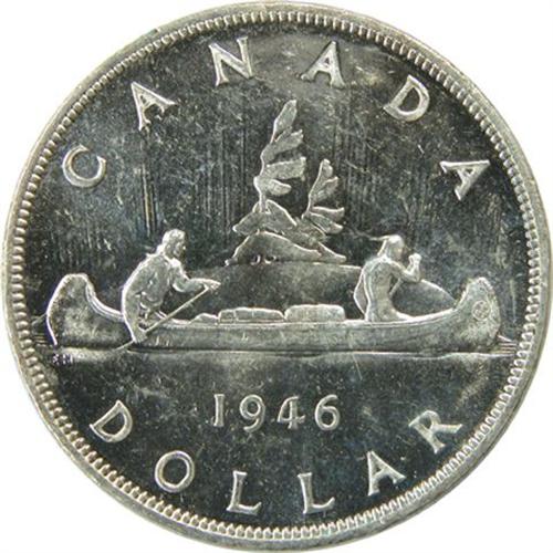 Canada Silver Dollar 1946 Very Choice Uncirculated. This is a fully struck piece with great lustre and near flawless untoned surfaces. Ex 2000 CNA Auction, Lot 1226