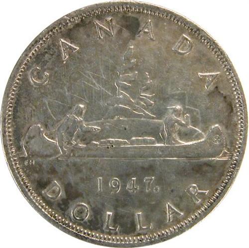 Canada Silver Dollar 1947 Maple Leaf, Doubled HP, VF-EF, scratches. A light-medium toned piece with some light pin scratches on the reverse