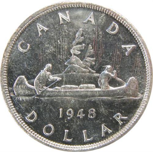 Canada Silver Dollar 1948 ICCS MS-62. This is a fully struck and near untoned piece with great lustre