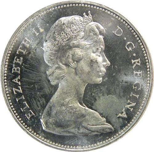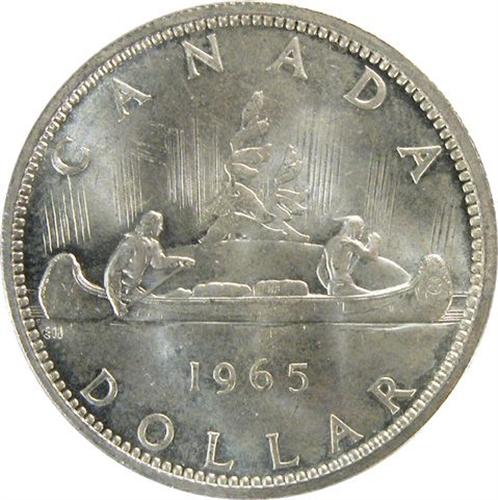 Canada Silver Dollar 1965 Type 5 ICCS MS-64. Pale golden toning. Tied highest graded by ICCS