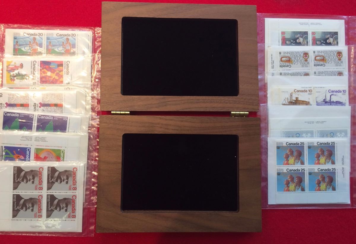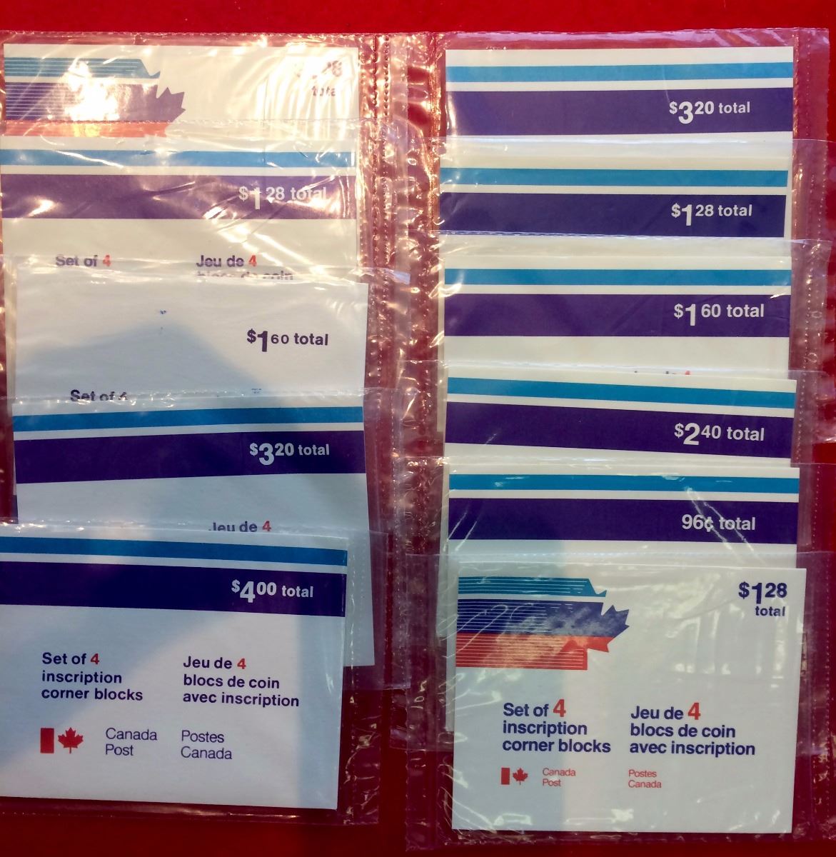 Canada Stamps, Set of 4 Inscription Corner Blocks, set of 11 pieces, present in wooden stamp shape box