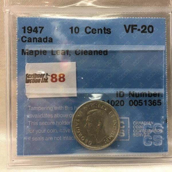 Canada Ten Cent 1947 (Maple Leaf, Cleaned) CCCS Grade VF-20