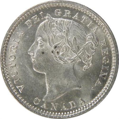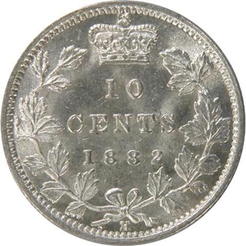Canada Ten Cents 1882H ICCS MS-64. This is a fully struck piece with great lustre and rather flawless surfaces that are very pale golden toned with four darker accents, likely from pinholes in an old 2x2. Rarely found this nice, it is the solo third highest graded by ICCS