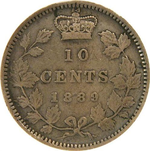 Canada Ten Cents 1889 ANACS VF Details, Graffiti, Tooled, Cleaned, Net VG-8. Even with its abusive previous owners, this is still a collectible example of the key date. It is now retoned in light golden greys