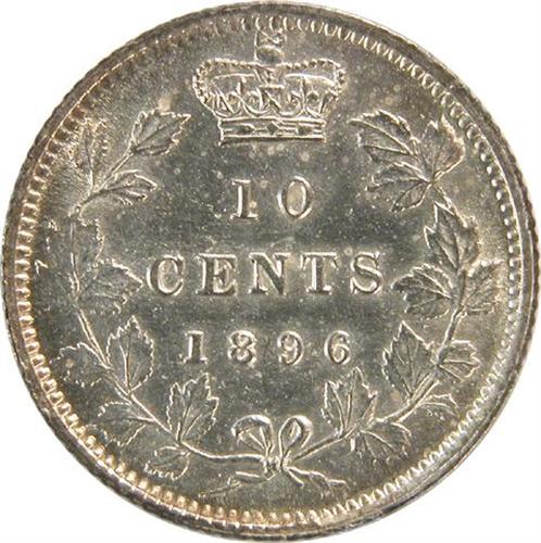 Canada Ten Cents 1896 Obverse 6 ICCS MS-60 Harshly Cleaned. This is a fully struck, pale golden toned piece that had near-flawless surfaces before an unfortunate abrasive cleaning. It is still strongly lustrous