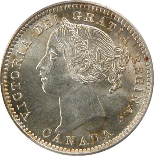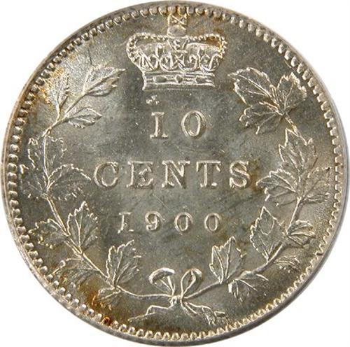 Canada Ten Cents 1900 PCGS MS-65. This is a fully struck piece with great lustre and rather flawless surfaces that have a very pale golden toning with light ambers toward the rims. It is tied as the fourth highest graded by PCGS