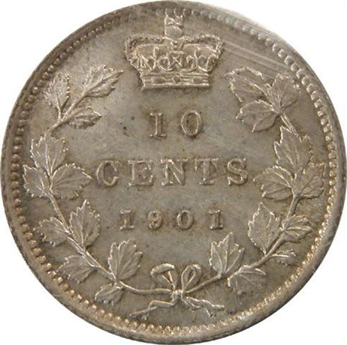Canada Ten Cents 1901 Norweb ICCS MS-65. This is a fully struck piece with strongly lustrous and near flawless surfaces that are toned in light golden tans with amber accents. It is tied with two others as the second highest by ICCS. From the Norweb Collection