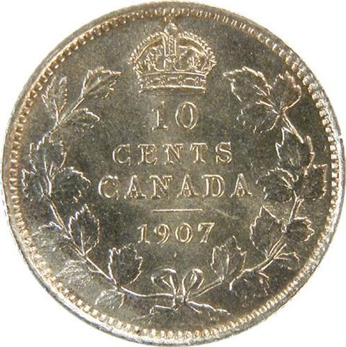 Canada Ten Cents 1907 CCCS MS-60. Great lustre and quite flawless pale golden toned surfaces