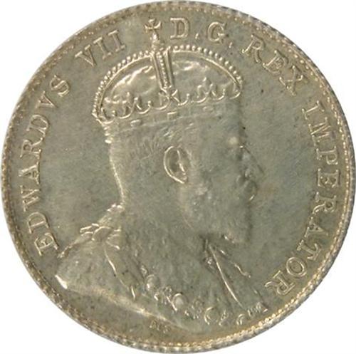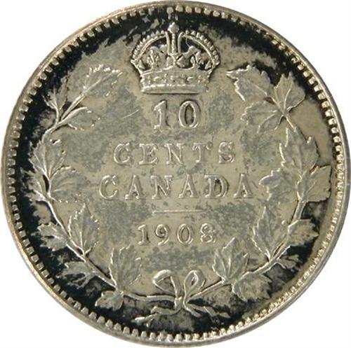 Canada Ten Cents 1908 ICCS SP-64. Near flawless surfaces with pale golden toning with dark rim toning on the reverse. It is tied as the sixth highest by ICCS