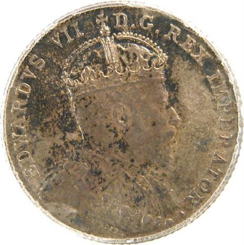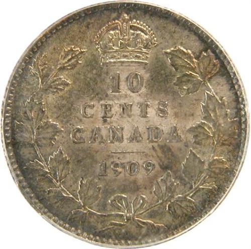 Canada Ten Cents 1909 Victorian Leaves PCGS MS-60. A nicely lustrous piece with rather attractive light-medium golden amber and blue toning