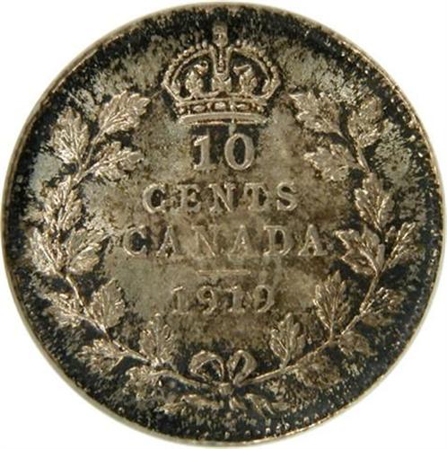 Canada Ten Cents 1919 NGC MS-64. A fully struck piece with nicely lustrous pale toned surfaces with dark accents