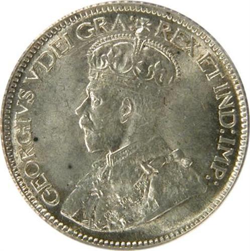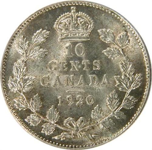Canada Ten Cents 1920 PCGS MS-63. This is a fully struck and nicely lustrous piece with pale golden toning