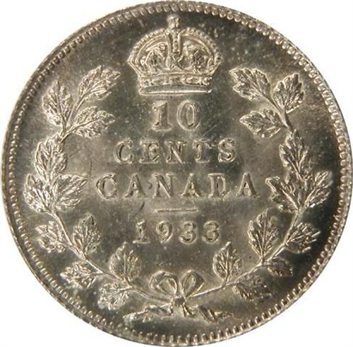 Canada Ten Cents 1933 ICCS MS-64. This is a fully struck piece with great lustre and near flawless pale golden toned surfaces . It is tied as the seventh highest by ICCS