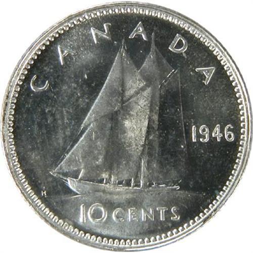 Canada Ten Cents 1946 ICCS MS-65. A fully struck piece with great lustre and near flawless untoned surfaces. It is tied as the highest graded by ICCS