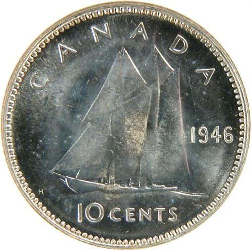 Canada Ten Cents 1946 Pittman NGC MS-65. Pale golden toning. It is tied as the third highest by NGC