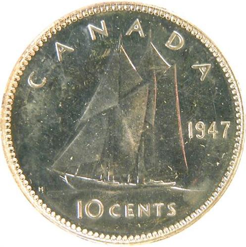 Canada Ten Cents 1947 PCGS SP-65. This is a superbly lustrous and pale golden toned example