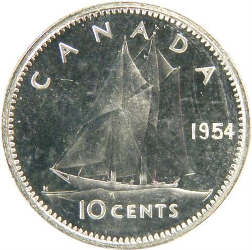 Canada Ten Cents 1954 ICCS PL-64 Ultra Heavy Cameo. This is another near untoned example. Only four Ultra Heavy Cameos graded higher by ICCS